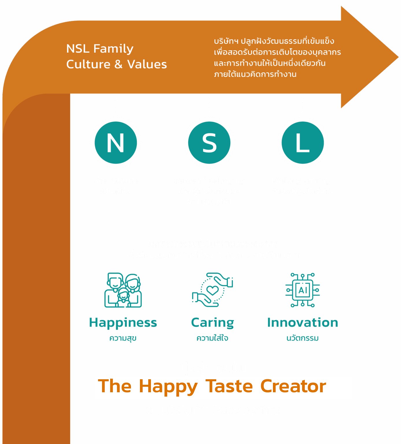 NSL ได้กำหนกลยุทธ์การเติบโตอย่างยั่งยืนสู่ปี 2573 ที่ครอบคลุมมิติด้านความยั่งยืนทั้ง 3 มิติ ได้แก่ เศรษฐกิจ สังคม และ สิ่งแวดล้อมซึ่งผสานรวมอยู่ในการดำเนินธุรกิจของบริษัทฯ และกลุ่มบริษัทฯ ตลอดจน การส่งมอบนโยบายและแนวทางปฏิบัติที่ดีสู่ผู้มีส่วนได้เสีย ตลอดห่วงโซ่คุณค่า ทั้งในและต่างประเทศ เพื่อให้การดำเนินการสอดคล้องและเป็นไปตามวิสัยทัศน์ขององค์กร “ The Happy Taste Creator”